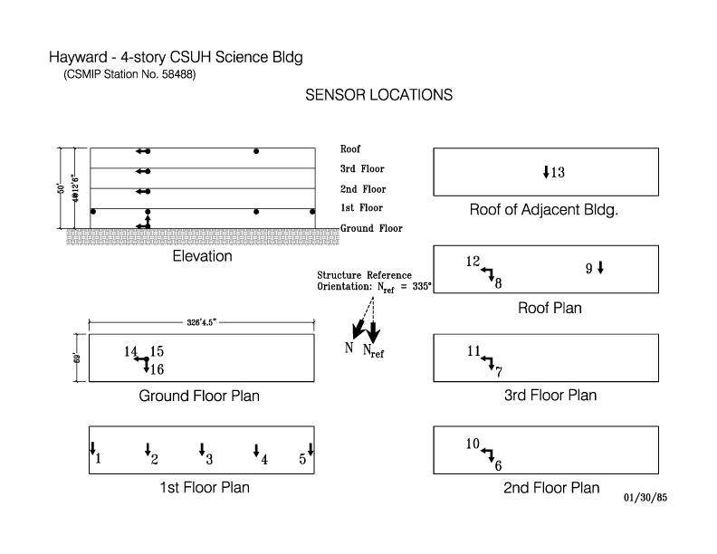 | Instrumentation | 1984. 16 accelerometers, on 5 levels in the building. 1 accelerometer on roof of adjacent building. |